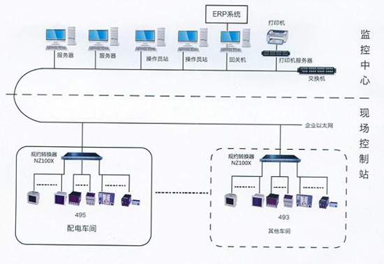 根據(jù)車間設(shè)備較多,分布比較分散的特點(diǎn),配電車間電量采集選用NZ194E完成一回線全電量采集,如電流、電壓等。其他監(jiān)控模塊選用NZ194I/O,采集直流模擬量如車速、溫度、流量等數(shù)據(jù),實(shí)現(xiàn)對車間生產(chǎn)設(shè)備的全面監(jiān)測。同時通過RS485總線把數(shù)據(jù)集中到串口服務(wù)器NZ100X上,集中后經(jīng)以太網(wǎng)把數(shù)據(jù)送往監(jiān)控中心,由NZ800P配電電動化系統(tǒng)軟件處理。